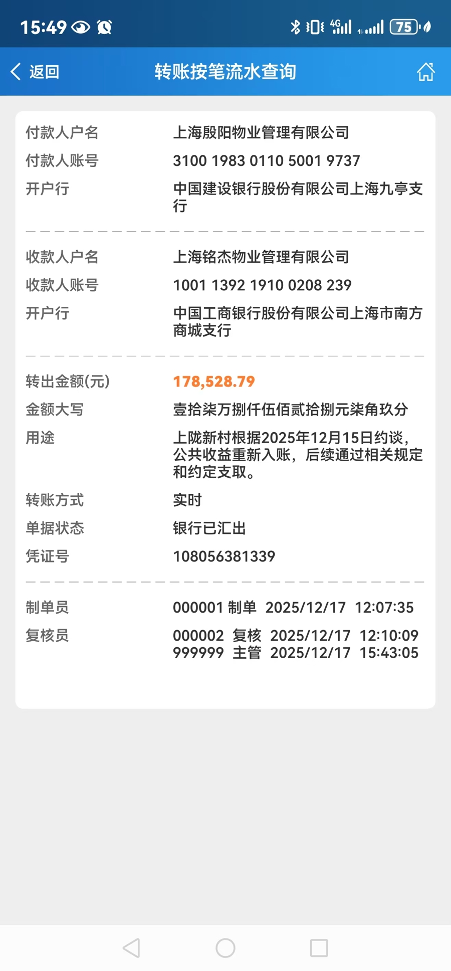 12月11日,新民·上观App刊登《“这笔钱必须要回来!”沪上小区物业侵占17万公共收益拒不归还,被追账到底》文章,反映了闵行区上陇新村小区前物业撤离后,业委会查账发现有一笔17万余元的公共收益没有迟迟没有入账的事情。报道发布后,引发相关部门高度关注,并对涉事物业进行了约谈,督促其尽快将该公共收益入账。记者获悉,涉事物业今日(17日)已将这笔17.8万余元的费用进行了归还。