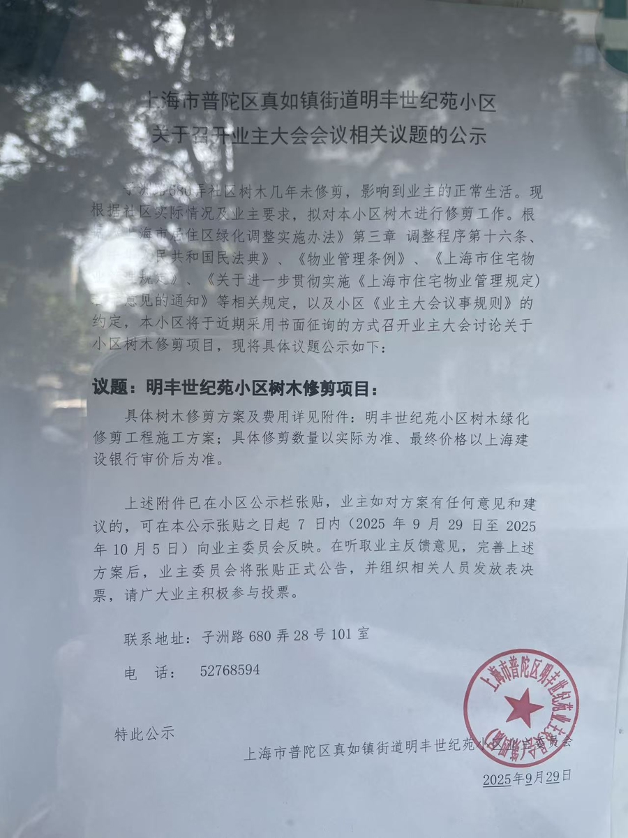 在该小区的公告栏上,记者看到一份由小区业委会出具的“明丰世纪苑小区树木修剪项目”的公示,公示内容包括修剪方案、修剪数量、报价清单等内容。根据公示,小区将对345棵直径为15—66厘米的树木进行修剪搭搭网,总费用为25.8万余元。目前,第一批树木已经修剪完毕。