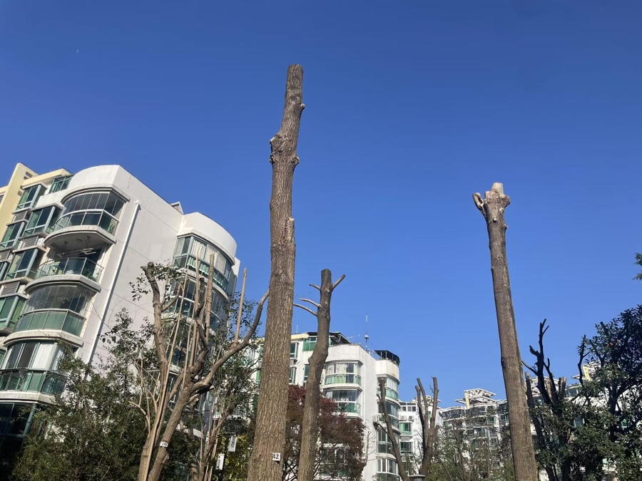 从流程上来讲,本次修剪做到了合规,但在具体修剪作业中,是否规范呢?尤其是居民提出的位于景观池周边的四棵大树,并不存在遮挡阳光的问题,为何被修成了“电线杆”?